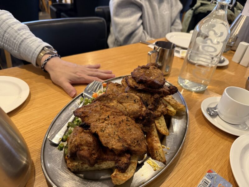 ランチ。マッシュルームスープと豚のステーキ2枚でした。お肉の下には、ポテトとマッシュドポテトがあり、量はかなり多かったです。